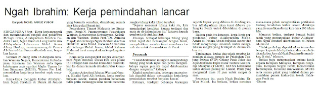 Berita Pemindahan Makam Ngah Ibrahim Long Jaafar dan Laksamana Mohd Amin Duakap dipindah dari Perkuburan Al-Junied Singapura dibawa semadikan di Negeri Perak